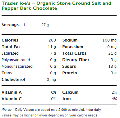 Trader Joe's Organic Stone Ground Salt and Pepper Dark Chocolate Nutritional Information