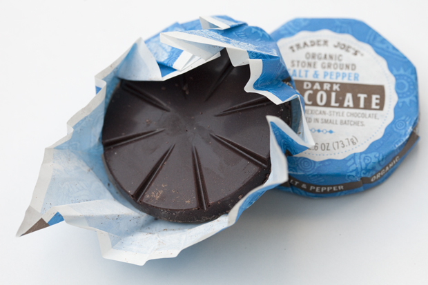 Now, my reservations about dark chocolate are well documented, and never in my life have I heard of such a combination with two common table seasonings, but if Trader Joe’s can keep dishing it out, I can keep taking it.