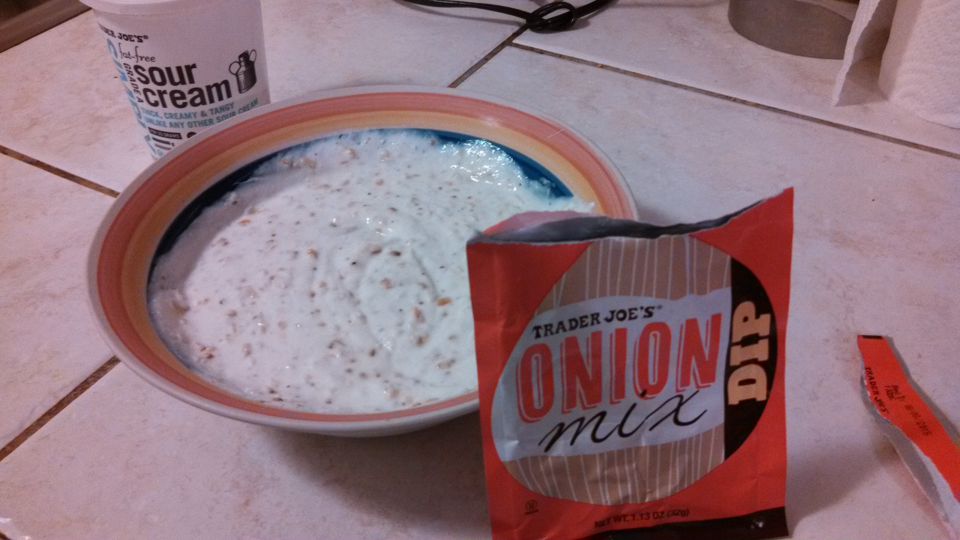 Posted: September 17, 2013 Filed under: Dip, Onion, Trader Joe's Brand | Tags: dip mix, onion dip 6 CommentsOnion dip, one of mankind’s most favorite dips. With the exciting arrival of Trader Joe’s Onion Dip Mix, they have now fulfilled the requirement that all supermarkets sell some type of powdered onion dip mix. I picked this up because it was new, and that’s always cool, and because onion dip is one of the most ordinary things you’re ever going to encounter in your life. Powdered onion dip mixes seldom, if ever, vary – presumably it’s all made in the same enormous mixing plant in New Jersey somewhere and then packaged with different labels. Trader Joe’s treads so far from the beaten path, is so devoted to bringing us strange and mysterious things, that it seemed weirdly incongruous that they’d be offering something as mundane and prosaic as onion dip. Surely they’ve got something sneaky planned with their onion dip, some uniquely Trader Joe’s twist hidden in this little orange packet.