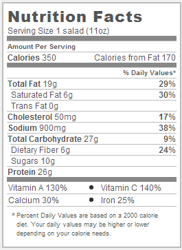 Nutritionally, you’ll have to pay a light toll for the rich flavors. Even with dressing on the salad comes to a scant 350 calories, unfortunately nearly half of those are from fat. The hearty helping of cheese (attributing to the above mentioned chewiness) is the culprit here – even without the dressing this salad still covers 20% of your daily value of fat. Of course, you’ll be getting 26 grams of protein as well, and only 27 grams of carbs (6 of those from fiber).
