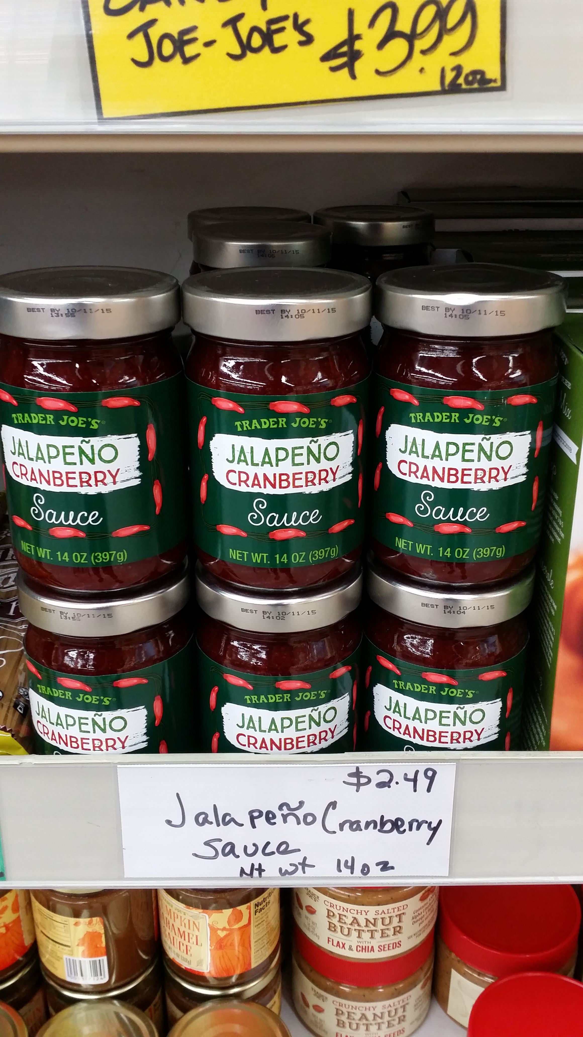 Posted: November 18, 2014 Filed under: Condiments, Sauces, Trader Joe's Brand | Tags: 3 stars, cranberries, cranberry sauce, jalapeno, Trader Joe's 1 CommentIt’s the holiday season – Thanksgiving, Christmas, all that jazz. The holidays, more than any other time of the year, are a time of traditional foods – of stuffing, turkey, mashed potatoes, pie and, yes, cranberry sauce. Of course, just because something is a tradition doesn’t mean Trader Joe’s isn’t going to try and find some way to screw with it. Case in point, the brand new Trader Joe’s Jalapeno Cranberry Sauce.