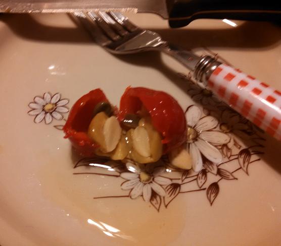 I do like these stuffed peppers, and I’d love to snack down on them, but there really doesn’t seem to be a good way to do that. It’s tricky to fish the peppers out of the jar without them falling apart – trying to get the oil off of them without ruining their delicate construction is even harder. Leaving the oil on is always, an option, but the result is a big pool of oil on your plate or running down your finger. That’s not the end of the world, obviously, but it does limit how you eat and serve them.
