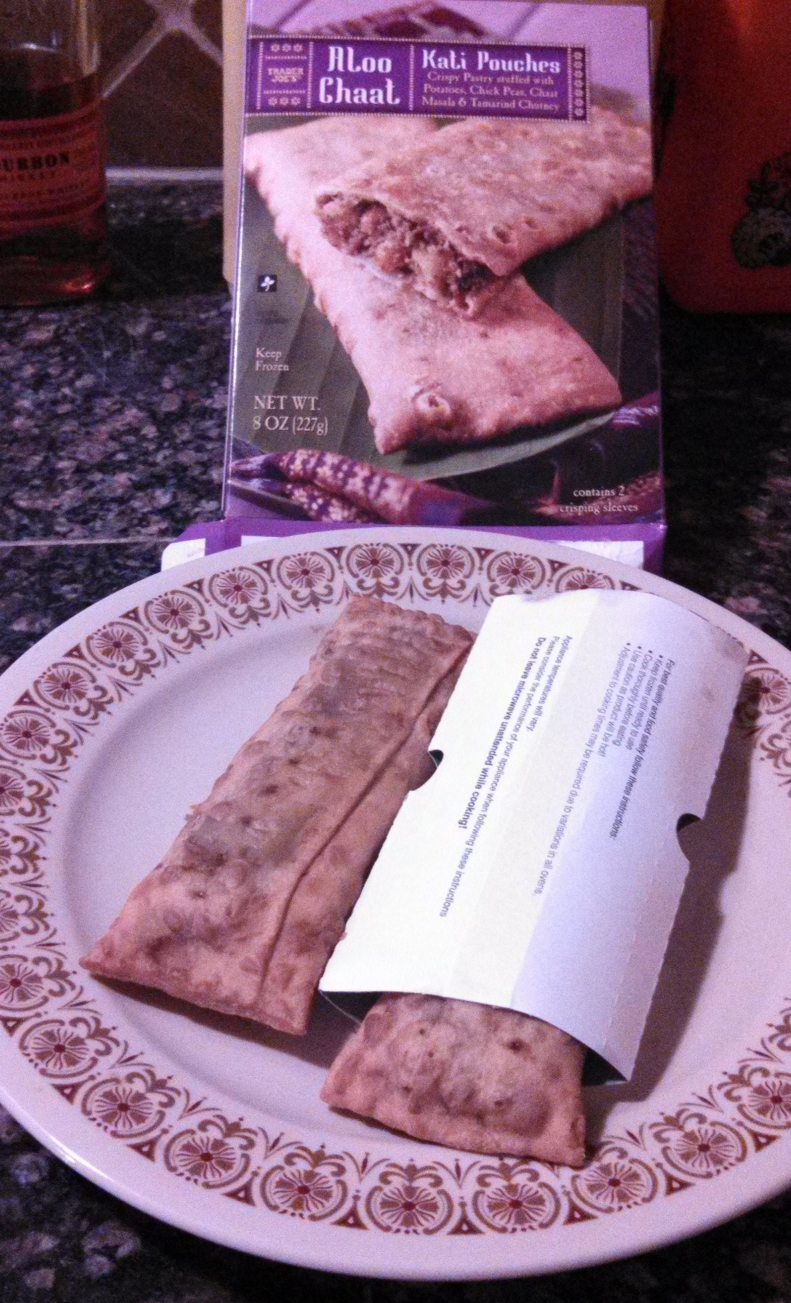 I talked a little bit about the myar sack full of bbq’d Punjab Eggplant (quite tasty, by the way), and I’ll probably write about their chaan masala later this week (so, you know, buckle up your seat belts for that). Like most of Trader Joe’s other frozen Indian cuisine offerings, those items are your typical slap-it-in-the-microwave-for-3:00-and-hope-for-the-best style meal. Trader Joe’s Aloo Chaat Kati Pouch takes this level of casual cuisine to a whole new level.