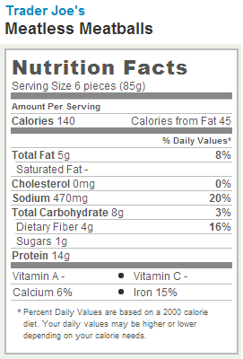 are getting a ton of these guys. These are cocktail meatballs, not the big honking ones you get in Trader Joe’s regular bag of frozen meatballs. The move feels like it may be a practical one, as even at their smaller size the meatless meatballs have a certain tendency to break up if played around with too much. On the plus side, they’re down right healthy compared to Trader Joe’s ordinary beef variety meatballs. Each six meatball serving has only 140 calories, 45 from fat, and 13 whopping grams of protein.